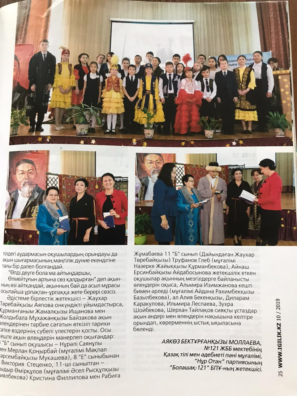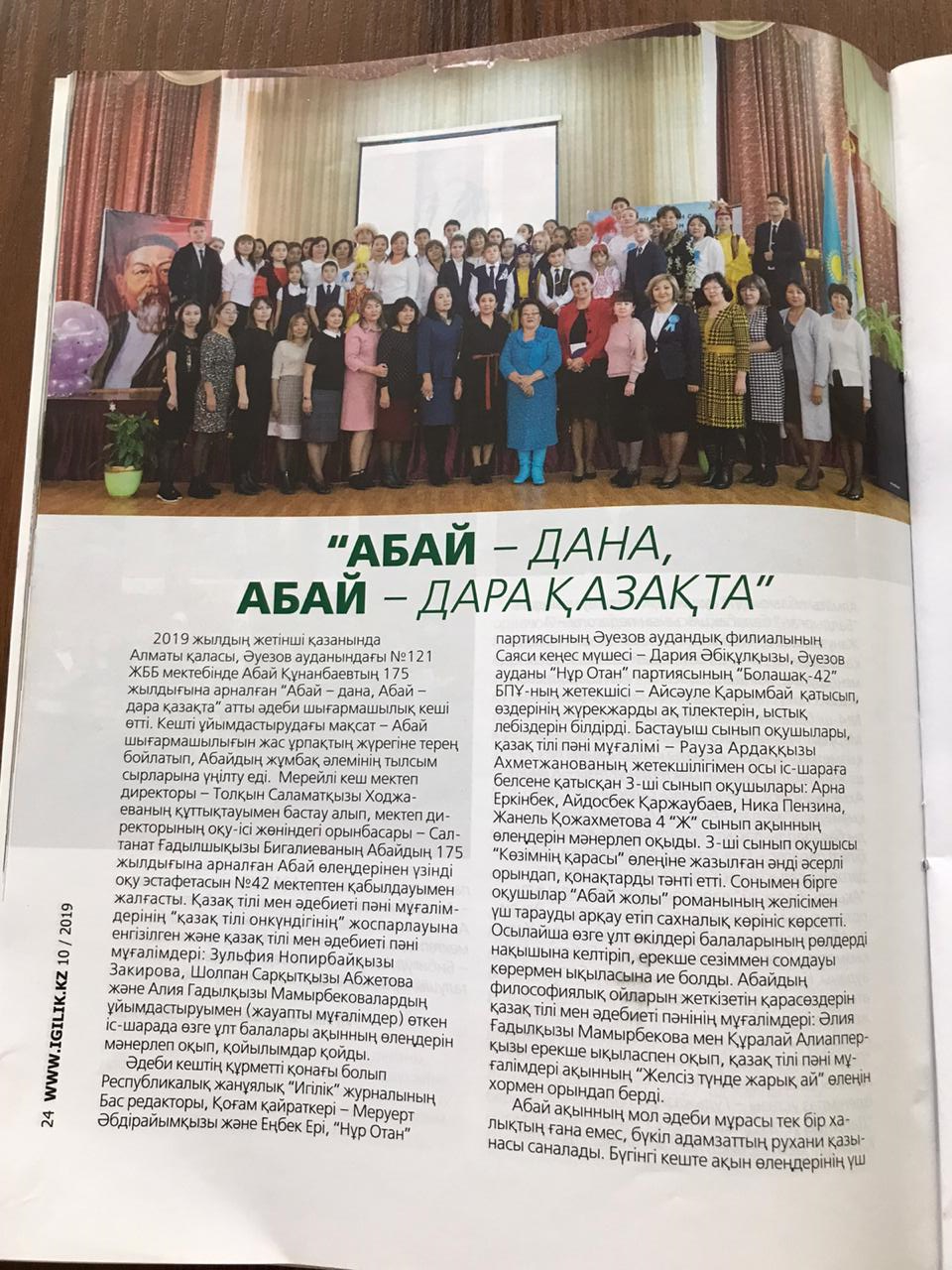 Алматы қаласы Әуезов ауданындағы №121 ЖББМ мектебінде Абай Құнанбаевтың 175-жылдығына арналған «Абай- дана, Абай- дара қазақта» атты әдеби шығармашылық кеші өтті. Кешті ұйымдастырудағы мақсат- Абай шығармашылығын жас ұрпақтың жүрегіне терең ойлатып, Абайдың жұмбақ әлемінің тылсым сырларына үңілту еді. Әдеби кештің қонағы болып Республикалық жанұялық Игілік журналының Бас редакторы, Қоғам қайраткері- Меруерт Әбдірайымқызы және Еңбек Ері, « Нұр Отан» партиясының Әуезов аудандық филиалының Саяси кеңес мүшесі- Дария Әбіқұлқызы, Әуезов ауданы «Нұр Отан» партиясының «Болашақ- 42» БПҰ-ның жетекшісі- Айсауле Қарымбай қатысып , өздерінің жүрекжарды ақ тілектерін, ыстық лебіздерін білдірді.