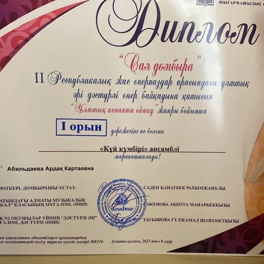 «Күй күмбірі» домбырашылар ансамблі Ұлттық аспапта ойнау жанрынан жас өнерпаздарға арналған республикалық байқау 1 орын. Көркемдік жетекшісі Әбілдаева А.Қ.Ансамбль домбристов “Күй күмбірі”.Республиканский конкурс по жанру игры на национальном инструменте молодых артистов 1 место.