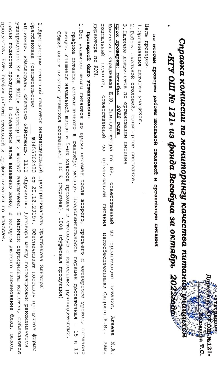 02 ноябрь 2022 0 1 2 3 4 5 Справка комиссии по мониторингу качества питания учащихся "КГУ ОШ №121" из фонда Всеобуча за октябрь 2022 года Осы беттің QR-коды:QR-код этой страницы: